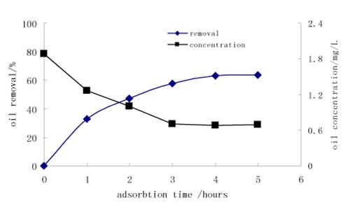 吸附效率在第一個小時內迅速增加,三小時吸附后趨于穩定,最大除油率為71%。三小時后沒有出現明顯的除油增加,相反,由于解吸過程出現少量的油濃度增加。結果,活性炭的最佳吸附時間是三小時。