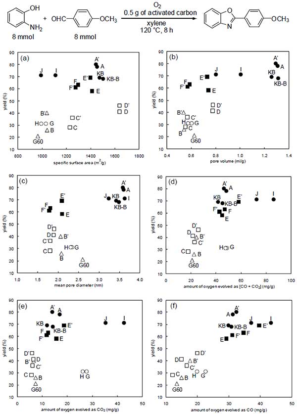 圖2顯示了活性炭的性質與氧化芳構化產率之間的關系。很明顯,化學活性炭(圖2中的實心符號)比蒸汽活性炭(未填充符號○□△)具有更高的反應性。然后,我們將注意力轉向表面氧基團,因為化學活化方法通常在比蒸汽活化方法更低的溫度下進行,因此通過前一種方法獲得的活性炭表面上保留了更多的表面氧基團。如在所示圖2(f)中,其演變為CO表面氧基具有提高檢查的所有特性中的反應產率的最佳趨勢??傃趿恳訡O和CO 2形式出現而作為CO 2放出的氧氣量與反應產率沒有很強的關系[ 圖2(d),(e)]。在這里,CO將來源于苯酚,羰基和醌基團,CO 2將來自存在于原始活性炭表面上的羧基和內酯基團。比表面積,孔體積和平均孔徑似乎與反應產率幾乎沒有關系[ 圖2(a),(b),(c)]。