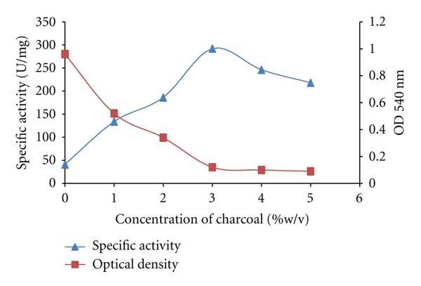 圖1中顯示的結(jié)果顯示了各種濃度的活性炭對(duì)純化真菌淀粉酶的影響。 當(dāng)活性炭濃度增加到3%w/v時(shí),葡糖淀粉酶的比活性顯著增加,最適比活性為250U/mg。 進(jìn)一步增加超過3%(w/v)導(dǎo)致其具體活動(dòng)減少。在處理的樣品中觀察到約90%的濁度降低。 據(jù)觀察,隨著所用木炭量的增加,吸收速率在數(shù)量上變化。據(jù)報(bào)道吸附程度受吸附劑對(duì)吸附劑的可及性的影響。
