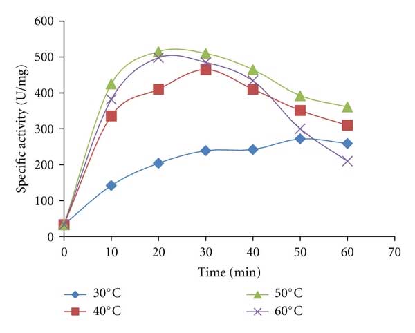 圖2中的結(jié)果總結(jié)了時(shí)間和溫度對(duì)活性炭純化淀粉酶的影響。 很明顯,在高溫下通過活性炭純化真菌淀粉酶使真菌淀粉酶的比活性顯著增加。 在50℃下,在20分鐘的駐留時(shí)間下獲得520U/mg的最佳比活性。 然而,在溫度超過50℃和超過30分鐘的較長時(shí)間用活性炭進(jìn)行酶處理導(dǎo)致淀粉酶活性降低。顯然,升高的溫度增強(qiáng)了活性炭的蛋白質(zhì)吸收和脫色能力。 吸收率和吸收能力主要取決于活性炭的表面化學(xué)性質(zhì),接觸時(shí)間和溫度。