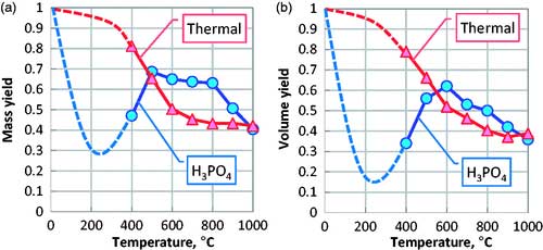 圖1.質(zhì)量(a)和體積(b)碳化過程中聚酰亞胺共聚物在有和沒有磷酸的情況下變成活性炭。