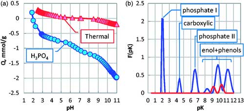 磷酸活化的活性炭有豐富表面官能團(tuán)由電位滴定法證明。質(zhì)子結(jié)合等溫線表明,無磷酸熱處理得到的活性炭在pH約為7時(shí)具有PZC中性表面,并含有非常少量的表面基團(tuán)(圖4(a))。相反,通過磷酸活化獲得的活性炭在酸性表面基團(tuán)的高濃度下在約pH 2下顯示具有PZC的酸性表??面。酸性表面基團(tuán)的計(jì)算分布顯示磷酸基團(tuán)的存在顯然源于磷酸、 羧酸基團(tuán)、磷酸酯基,烯醇和酚基的第二解離常數(shù)(圖3(b))。
