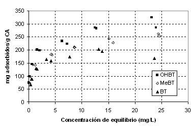 在圖1上的原始活性炭BT的(F),所述OHBT和濕潤活性炭吸附等溫線至pH 5。它被理解的是,最大吸附發(fā)生用于OHBT隨后MEBT目前, BT是最不吸附的。活性炭吸附容量的增加與苯并噻唑分子中甲基或羥基取代基的存在有關(guān)。