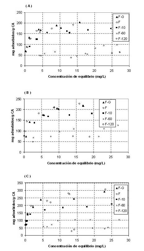活性炭呈現(xiàn)基本特性pH值PZC接近9. OHBT相對于MeBT和BT的吸附容量的增加可能與芳族體系中電子密度的增加有關(guān)。與甲基相比,羥基增加了芳族體系的電子密度。苯并噻唑分子中羥基和甲基的存在引起B(yǎng)T分子的芳族體系的電子密度增加,增加了原始活性炭的吸附能力。吸附能力的增加與苯并噻唑芳環(huán)的π電子體系和碳石墨平面的電子π能帶之間的分散力的增強有關(guān)。在圖2A,2B和2C分別示出了BT的吸附等溫線,和OHBT MEBT上經(jīng)歷與臭氧預(yù)處理10分鐘,(F-10),60分鐘(F-60)120分鐘活性炭(F- 120),并在氮氣流(FG)下在1,000℃下脫氧。
