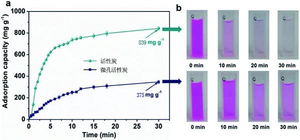 由于縮短吸附時間對于經(jīng)濟(jì)有效的工業(yè)操作具有重要意義,我們進(jìn)一步采用超聲輔助策略來加速RhB吸附并縮短制備的活性炭的飽和時間,這對制備的活性炭的孔結(jié)構(gòu)幾乎沒有影響。超聲輔助下的吸附時間固定為30分鐘。圖3a顯示了在30分活性炭和微孔活性炭作為時間函數(shù)的吸附容量,活性炭從中獲得高達(dá)839 mg/g-1的高RhB吸附容量。在30分鐘內(nèi)(飽和容量的99%),而微孔活性炭可以獲得67%的飽和吸附容量(345 mg/g-1)),進(jìn)一步證明了分級多孔活性炭相對于微孔活性炭的吸附動力學(xué)優(yōu)勢。圖3b進(jìn)一步說明了這兩種樣品隨時間的上清液的顏色變化,其生動地證明了活性炭相對于微孔活性炭的高速吸附能力。